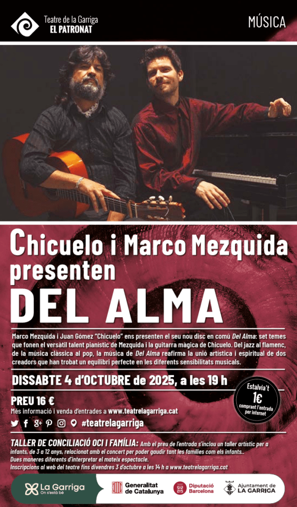 Marco Mezquida i Juan Gómez “Chicuelo” ens presenten el seu nou disc en comú Del Alma: set temes que fonen el versàtil talent pianístic de Mezquida i la guitarra màgica de Chicuelo. Del jazz al flamenc, de la música clàssica al pop, la música de Del Alma reafirma la unió artística i espiritual de dos creadors que han trobat un equilibri perfecte en les diferents sensibilitats musicals.